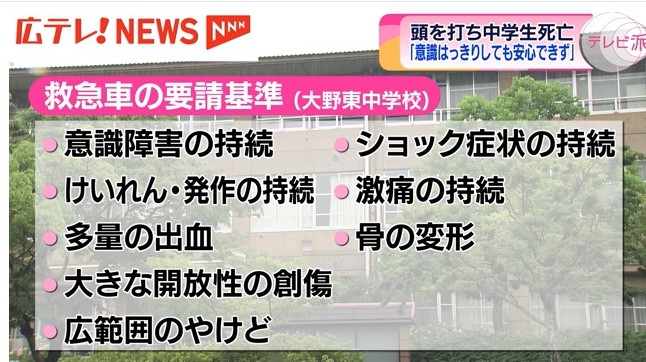 事故のあった中学校が救急車を要請する際の8項目の基準です。