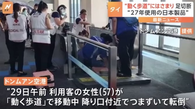 タイの首都バンコクのドンムアン国際空港で29日、動く歩道を通行中の女性(57)が機械に足を吸い込まれ、切断する事故があった。
