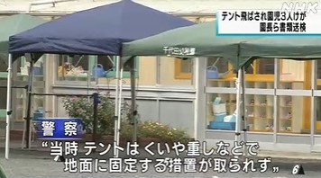 警察などによりますと、去年9月、幼稚園の園庭で運動会の練習を行っていたところ、強風にあおられてテントが飛ばされ、年中の園児3人に当たり3人が顔などに軽いけがをしました。