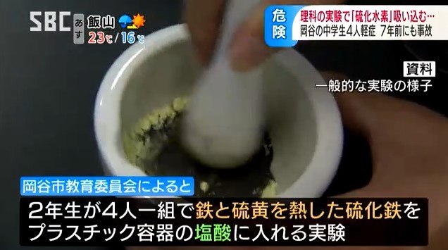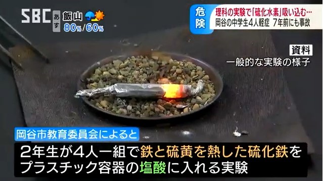 岡谷市教育委員会によりますと、2年生のクラスでは、4人一組になって、鉄と硫黄を熱してできた硫化鉄を、プラスチック容器の塩酸に入れて硫化水素を発生させる実験を行っていたということです。
