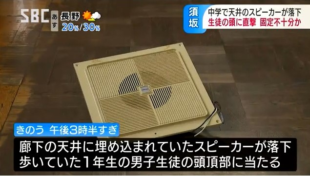 須坂市の中学校で、廊下の天井に設置されていたスピーカーが落下し、男子生徒1人がけがをする事故ありました。