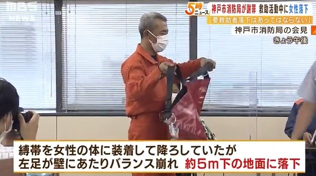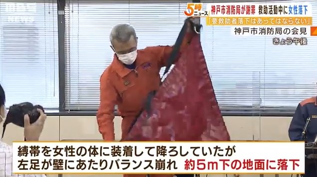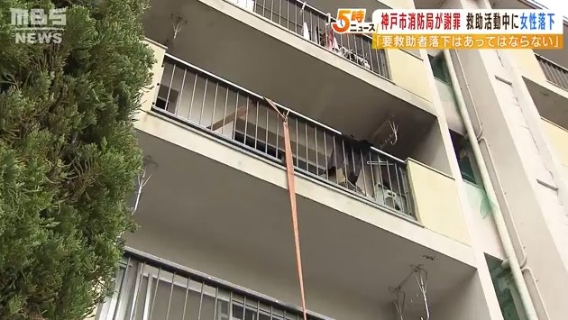 神戸市消防局によりますと、心肺停止状態だった住人の50代の女性をベランダから救助する際に、縛帯という器具を女性の体に装着して降ろしていたところ、女性の左足が壁にあたってバランスが崩れ、約5m下の地面に落下したということです。