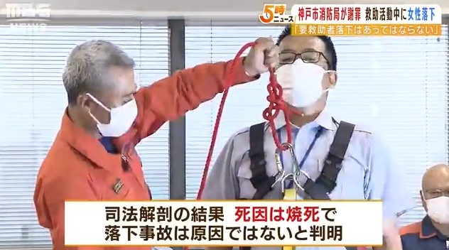 司法解剖の結果、死因は焼死で、落下事故は原因ではないと判明しましたが、神戸市消防局は7月21日に改めて事故について謝罪しました。