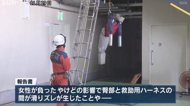 3回の会合を経て検証会がまとめた報告書によりますと、女性が負ったやけどの影響で臀部と救助用ハーネスの間が滑りズレが生じたことや、ベルトを締める際、圧迫しないよう少し緩めて締めたことなどが落下原因と推定されるということです。