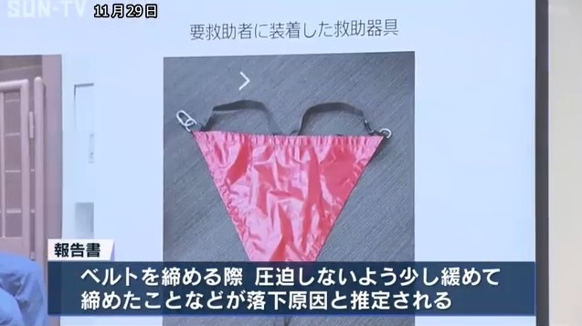 2022年11月29日20時6分にYAHOOニュース(サンテレビ)からは、事故報告書がまとまった、推定原因は火傷の影響で臀部とハーネスがずれたことや圧迫しないようハーネスを少し緩めて締めたことだったなど、下記趣旨の記事がネット配信されていた。