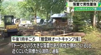 15日午後1時20分ごろ、上川管内上川町清川の層雲峡オートキャンプ場の建築現場で、男性から「作業中の仲間に雷が当たって負傷した」と119番があった。