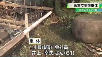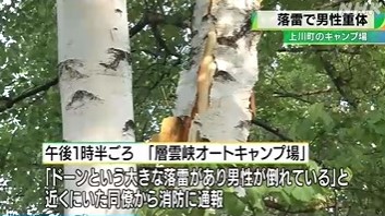15日午後1時半ごろ、上川町清川の「層雲峡オートキャンプ場」で、「ドーンという大きな落雷があり、男性が倒れている」と、近くにいた同僚から消防に通報がありました。
