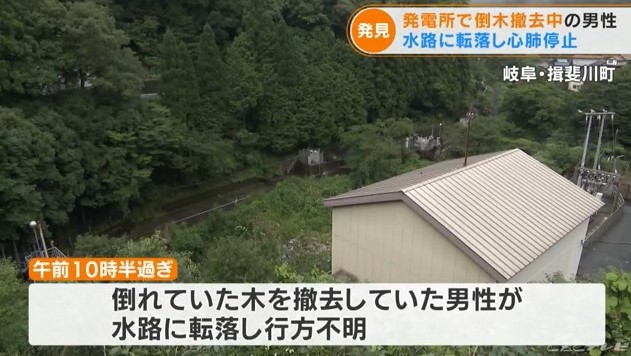 15日午前10時半過ぎ、岐阜県揖斐川町の中部電力河合発電所の近くで、倒れた木を撤去していた男性が水路に転落して、行方が分からなくなりました。