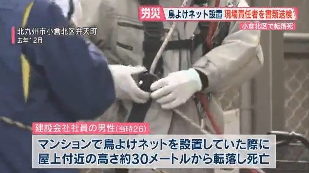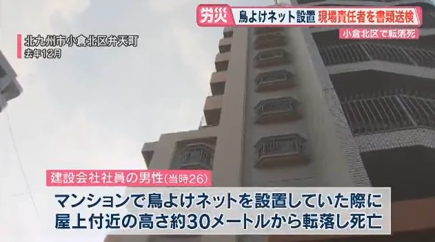 この事故は去年12月、北九州市小倉北区弁天町の10階建てマンションで、鳥よけネットを設置していた当時26歳の建設会社社員の男性が屋上付近の高さおよそ30メートルから転落し死亡したものです。