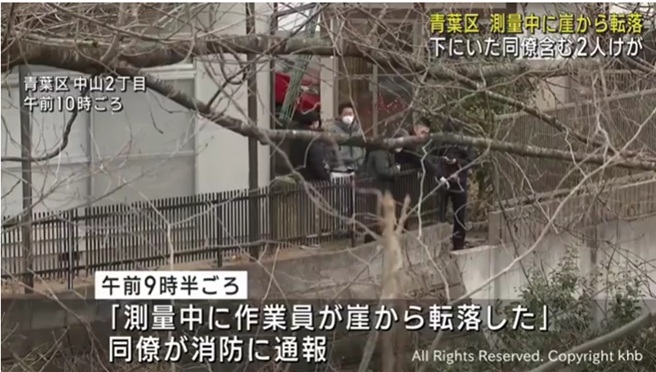 26日午前9時半ごろ、青葉区中山2丁目の住宅街で「測量中に作業員が崖から転落した」と同僚から消防に通報がありました。