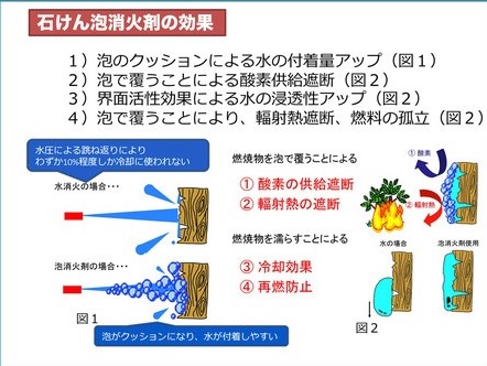 消火用の水に発泡剤を混ぜて放水すると、燃えている部分に泡が付着し、空気を遮断する作用などによって水だけの場合よりも、より効率的な消火が可能となる。