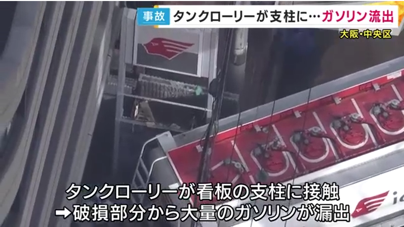 11日朝、大阪市中央区のガソリンスタンドでタンクローリーが物損事故を起こしました。