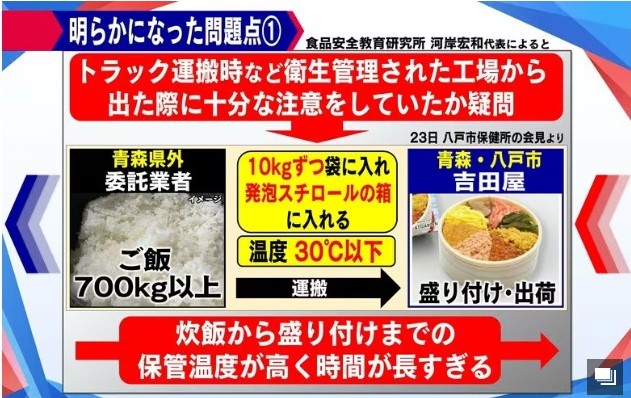 さらに、委託業者が配送で使った発泡スチロール製の外箱を、Y田屋が殺菌せずに盛り付け室に搬入したため、米飯や具材に菌が付着した可能性もあるとしている。