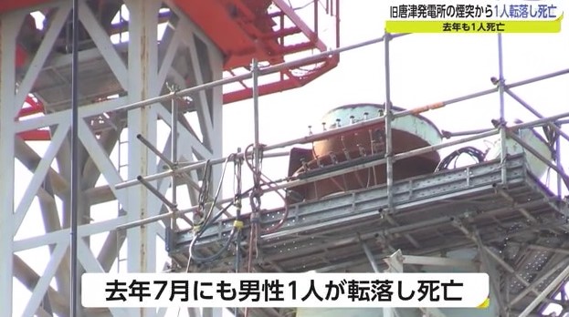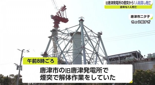 20日午前8時ごろ、唐津市の旧唐津発電所で煙突で解体作業をしていた唐津市菜畑の男性作業員(36)が、高さおよそ40メートルから転落し死亡しました。