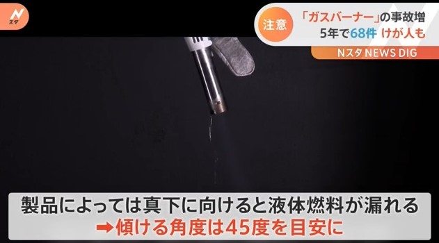 また、製品の種類によっては、真下に向けると燃料が液体のまま漏れて激しく燃え上ることもあるため、「傾ける角度は45度までを目安にしてほしい」と呼びかけています。