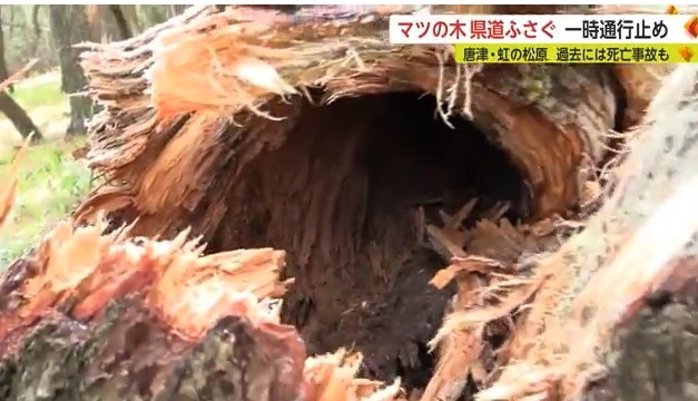 20日午前1時ごろ、唐津市鏡の県道虹の松原線で、折れたマツが倒れて道路をふさいでいるのを通行していた男性が見つけ、110番した。