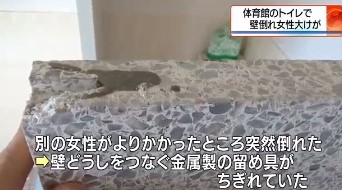 警察などによると、当時、体育館では中学生のバレーボールの試合が行われていて、個室トイレの中にいた39歳の別の女性がもたれかかったところ、高さ1m87cm、幅73cm5mm、厚さ4cmの壁が突然、倒れたという。