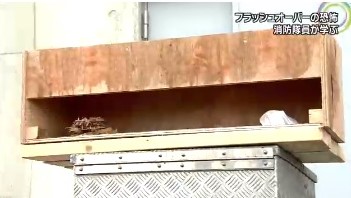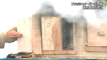 消防隊員たちは、はじめに、住宅に見たてた箱の中で木の棒や木くずなどに火がつけられ、「フラッシュオーバー」の前兆とされる煙が白から黒に変わる様子や、黒い煙に炎がはしる現象を見学した。