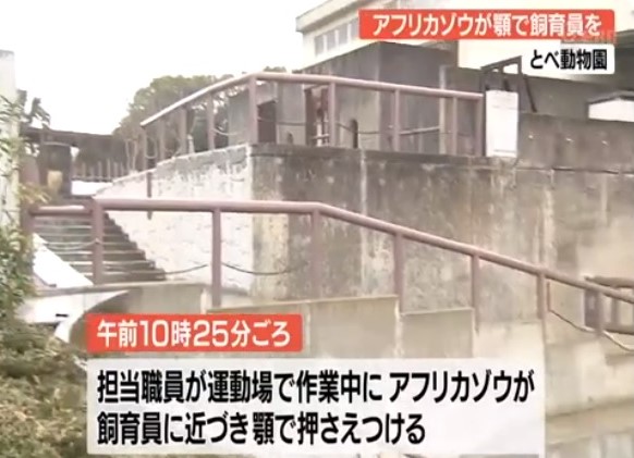 10日、とべ動物園(愛媛県砥部町)で、アフリカゾウが担当飼育員を顎などで押さえつけ大ケガをさせる事故があった。
