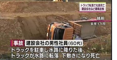 去年11月、越前市の河川の工事現場でトラックが水路に転落し、下敷きになった建設会社社員の男性が死亡した事故で、武生労基署は安全管理を怠っていたとして、労安法違反の疑いで建設会社などを書類送検した。