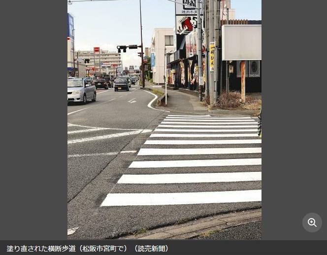 三重県松阪市内の横断歩道で視覚障害者の女性が車にはねられる事故があり、松阪署は8日、塗装が剥がれて見づらくなっていた横断歩道の塗り直しを行った。