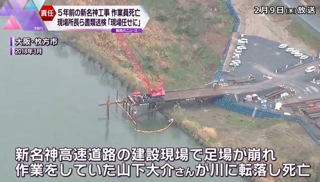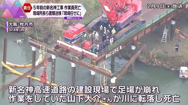 2月9日18時30分にYAHOOニュース(読売テレビ)からは、川の上での作業に舟が使えなくなったため足場を設置、それが重さに耐えきれず崩れた、元請けは計画変更は軽微なものゆえ安全確保は下請けが行うものと思っていたなど、下記趣旨の記事がネット配信されていた。