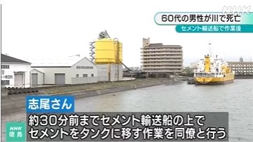警察によりますと、志尾さんは、川で見つかる30分ほど前まで、近くの岸壁につけたセメント輸送船の上でセメントを船から陸上のタンクに移す作業を同僚4人と行い、作業を終えて現場を離れようとしていました。