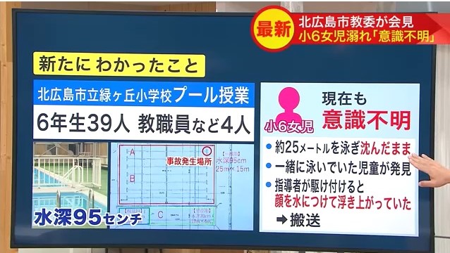 8月29日18時42分にYAHOOニュース(HTB)からは、溺れた児童は習熟度が一番高いグループに所属していた、25m泳ぎ切った付近で溺れたなど、下記趣旨の記事がネット配信されていた。