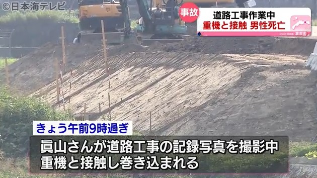 警察によると、事故が起きた倉吉市岡では道路工事が行われていて、8日午前9時過ぎ、眞山さんが工事の記録写真を撮影中、盛土を敷きならすために作業を行っていた重機と接触し、巻き込まれたという。