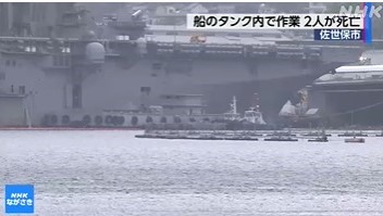 消防などが駆けつけたところ、アメリカ海軍の大型船に横付けされた汚水処理船のタンク内で、男性作業員2人が倒れているのが見つかり、意識がない状態で市内の病院に搬送されましたが、いずれも死亡が確認されました。