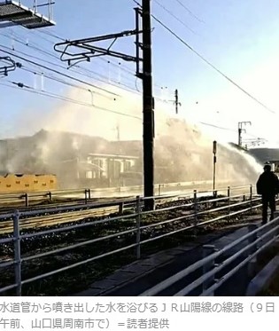 この時間帯に線路沿いの工業用水管から大量の水が噴き出しており、JR西日本中国統括本部は「水の影響で窓ガラスが割れた可能性がある」としている。