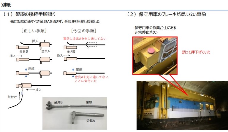 JR西日本は、30日、これについて、架線に通す金具の取り付け手順を誤ったことや、作業を終えた車両のブレーキが緩まず動かせなくなったのは、車両の非常停止ボタンを誤って押し下げていたことが原因だったと発表しました。