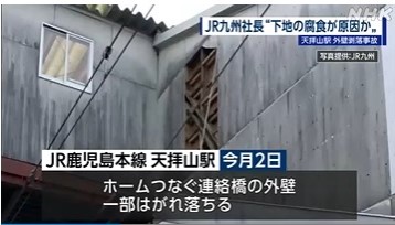 JR九州によると、落下した外壁は長さ90センチ、幅182センチ、厚さ5ミリのセメント板(重さ約12・5キロ)。