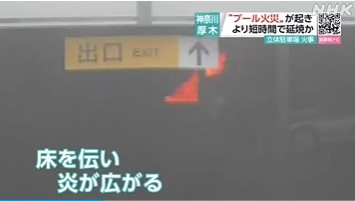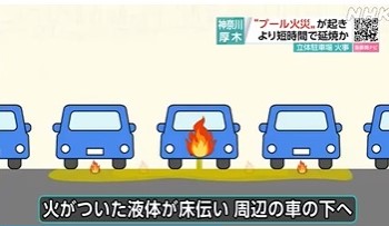 この炎について、関澤教授はガソリンなどの表面が燃える「プール火災」だと指摘していて、火がついた液体が床を伝って周辺の車の下に広がったことで、車から直接燃え移るより短時間で延焼が拡大した可能性があると分析しています。
