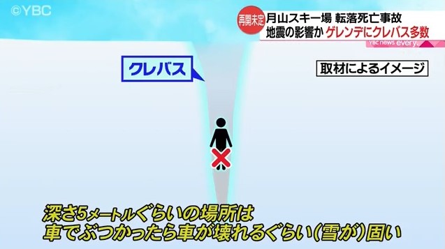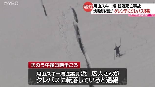 山形県西川町の月山スキー場で11日、クレバスと呼ばれる雪の割れ目に転落した男性従業員が死亡した。