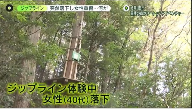 岐阜県関市のアスレチック施設で5日、ジップラインをしていた女性が約7メートルの高さから落下し、大けがをする事故が起きました。