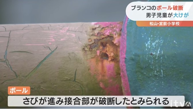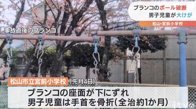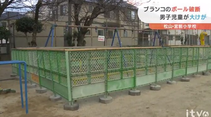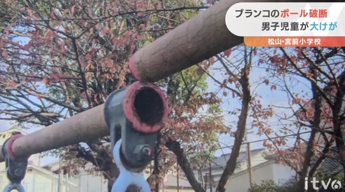松山市教育委員会によりますと、松山市立宮前小学校で11月4日、男子児童が休み時間に運動場でブランコに乗って遊んでいたところ、座面を吊るしていた鉄製のポールが破断しました。
