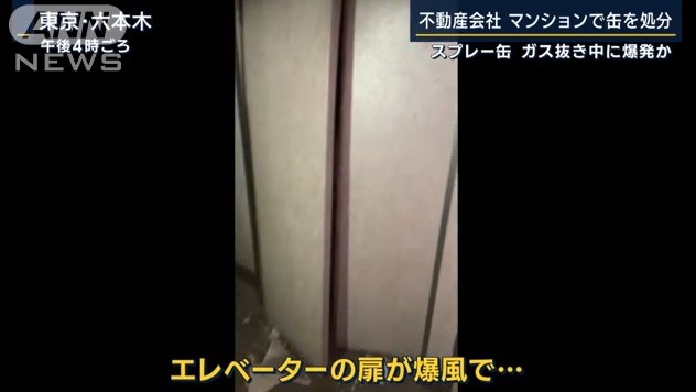 書類送検容疑は1月16日午前、東京都港区六本木のマンション内にある会社の倉庫で、必要な措置をせず、閉め切った状態の室内で、廃棄物のスプレー缶やライターなどをハンマーでたたいてガス抜き作業を実施。