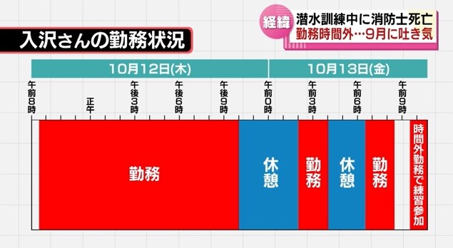 市消防本部によると、入沢さんは訓練の前日、12日の午前8時半から午後10時まで働き、その後、日付けをまたいで4時間の休憩。