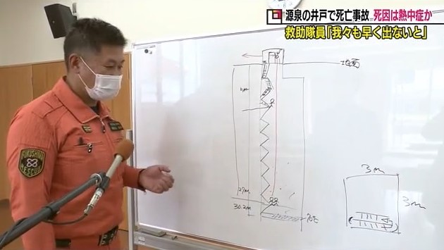 9月9日19時26分にYAHOOニュース(福島テレビ)からは、深さ30m付近の源泉のすぐ上に2人がいた、救助に入った消防士は体感60℃ぐらいに感じたなど、下記趣旨の記事がネット配信されていた。