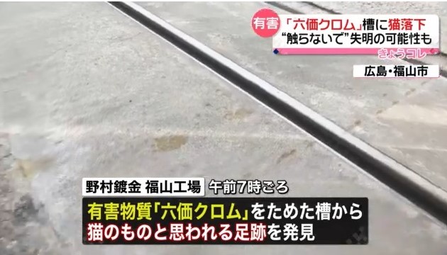 N鍍金福山工場によりますと、六価クロム槽にはカバーがかけられていましたが、ネコが落ちた衝撃でカバーが傾き、六価クロムの液体に体がつかったものとみられています。