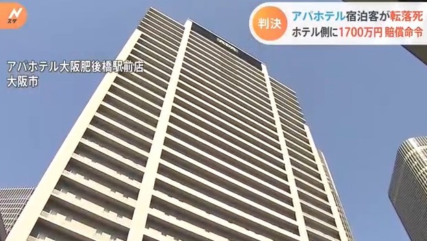 大阪市西区にある「アパホテル大阪肥後橋駅前店」=臨時休業中=の22階の客室の外にある非常用バルコニーから転落死した男性会社員(当時46歳)の遺族=神奈川県在住=がホテルを運営する「アパホテル」(東京都港区)に約1億3100万円の損害賠償を求めた訴訟の判決で、東京地裁は27日、同社に約1780万円の支払いを命じた。