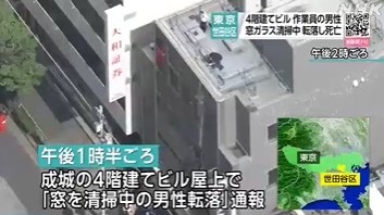 警視庁成城署によると、男性は作業を始めるため、屋上外から下に降りようとしたが、そのまま地上に落下。