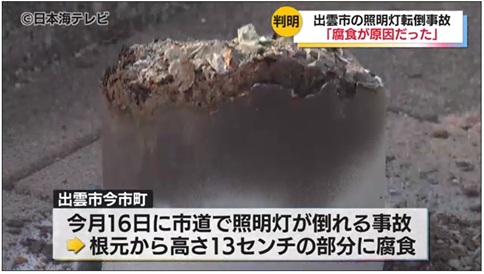 4月16日、出雲市今市町の市道で、設置してあった照明灯が倒れる事故があり、出雲市が原因を調べた結果、照明灯の根元から高さ13センチの部分に腐食が見つかったということです。