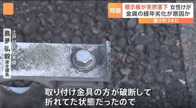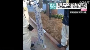 11月21日18時31分にYAHOOニュース(TBS NEWS)からは、江戸川区では表示板の定期点検は行っていなかったなど、下記趣旨の記事がネット配信されていた。