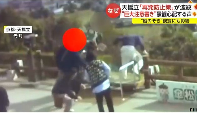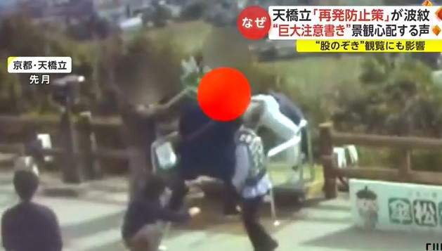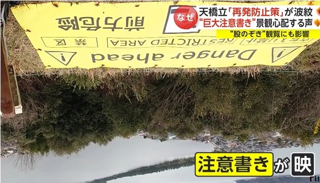 「股のぞき」で知られる日本三景の一つ「天橋立」(京都府宮津市)で起きた観光客の転落事故を受けて、「のぞき台」の真下にイエローの警戒色を使用した大きな「注意書き」が今年3月から設置された。