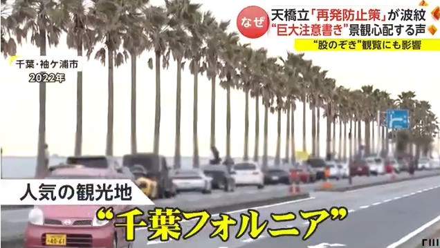 対策として、ヤシの木に「路上駐車禁止」と書かれた垂れ幕を設置するも、「景観を損なう」と、ここでも批判が殺到。