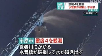 昨夜の地震で震度4を観測した市原市では、養老川にかかる水管橋が破損して水が噴き出しました。