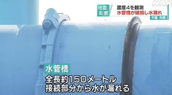 10月8日12時2分にNHK千葉からは、当該水管橋は開通後41年で、地震前の点検では異常は確認されていなかったなど、下記趣旨の記事がネット配信されていた。