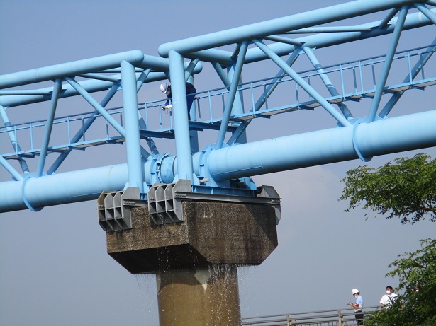 水管橋の上では作業員1人が漏洩箇所を点検中。